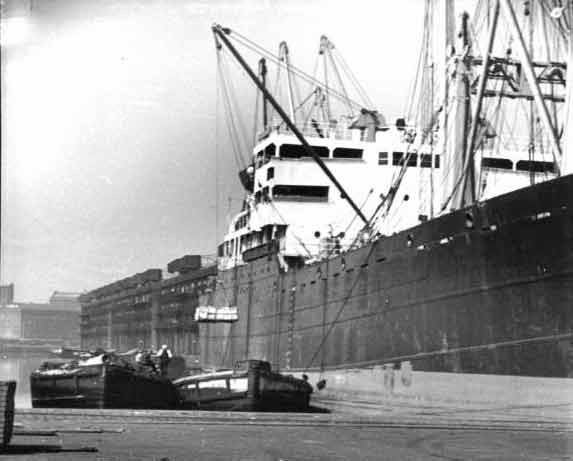 cargo from a cargo ship is being unloaded directly into waiting barges. These