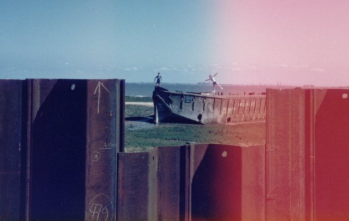[CLICK on Image for NEXT picture] The Barge as seen through the new Sea Wall (under construction) - Dave & Jacko