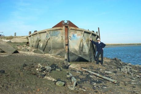 [Click on Image for NEXT] Dave has a final pose against this wonderfully preserved Barge. Like so many of her concrete cousins she is serving a useful purpose - In this case a Jetty for Barling. How could the 'Blue Meanies' of Canvey be so blind?